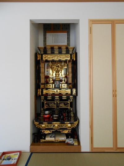 仏壇の上に飾りたいとのことでしたので、仏表装で仕上げました。外廻しは、準金襴鳳凰紋。内廻しは四ッ手雲です。本来仏表装ですと軸が金になりますが、今回は黒陶器素材にして全体的に落ち着いた色合いとなりました。仏間にもちょうど良く納まったのではないでしょうか。