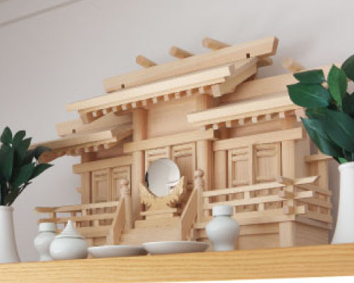 家の中の小さな神社。神社からいただいたお札をおまつりします。家を新築した時や、お店の開店・事務所開きの時などに、新しい神棚を整えて、一家の繁栄や健康、商売繁盛を願います。